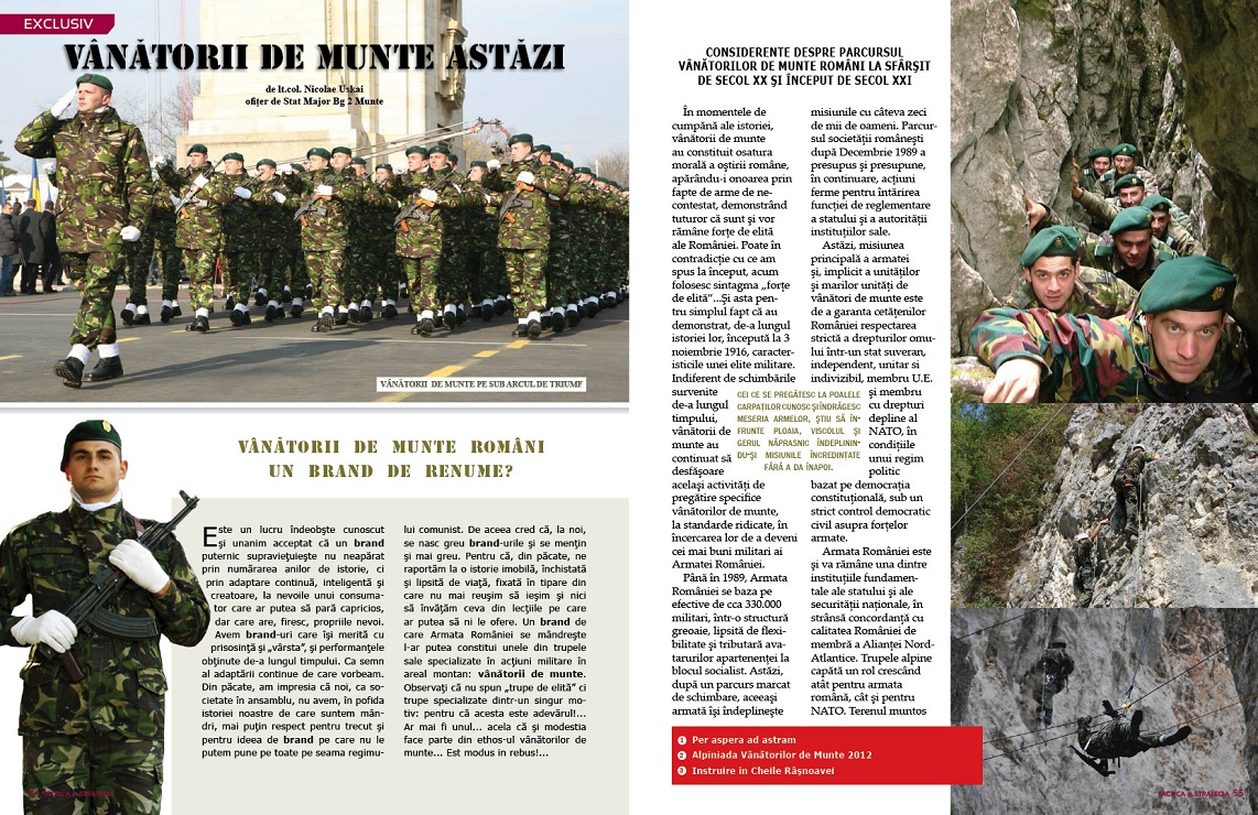 – Vînătorii de munte un brand de renume – Teatre de operații: Afganistan și Iraq – Evoluția vînătorilor de munte.