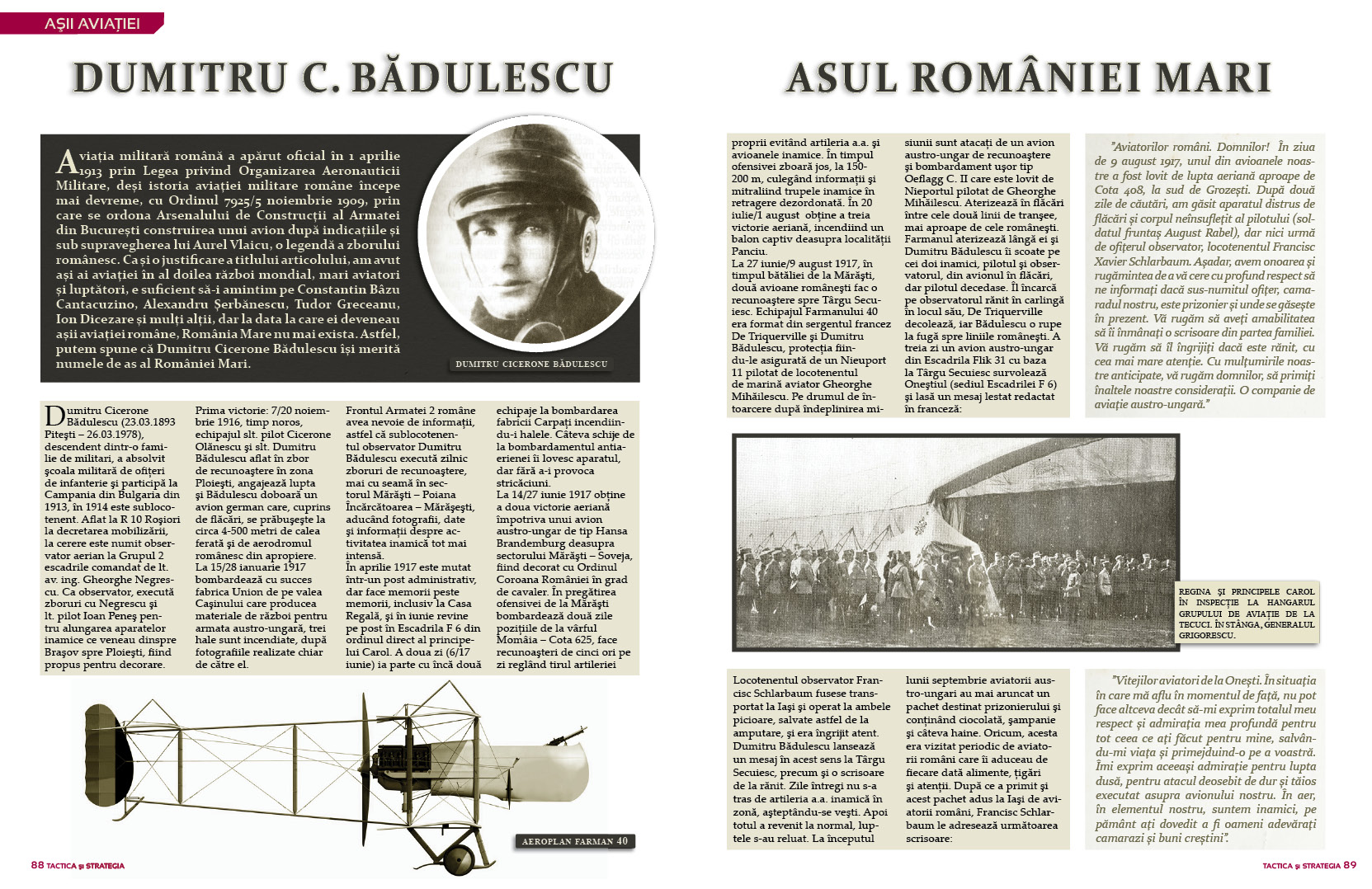 Dumitru Cicerone Bădulescu, Asul României Mari. Ca şi o justificare a titlului articolului, am avut aşi ai aviaţiei în al doilea război mondial, mari aviatori şi luptători, e suficient să-i amintim pe Constantin Bâzu Cantacuzino, Alexandru Şerbănescu, Tudor Greceanu, Ion Dicezare şi mulţi alţii, dar la data la care ei deveneau aşii aviaţiei române, România Mare nu mai exista. Astfel, putem spune că Dumitru Cicerone Bădulescu îşi merită numele de as al României Mari.